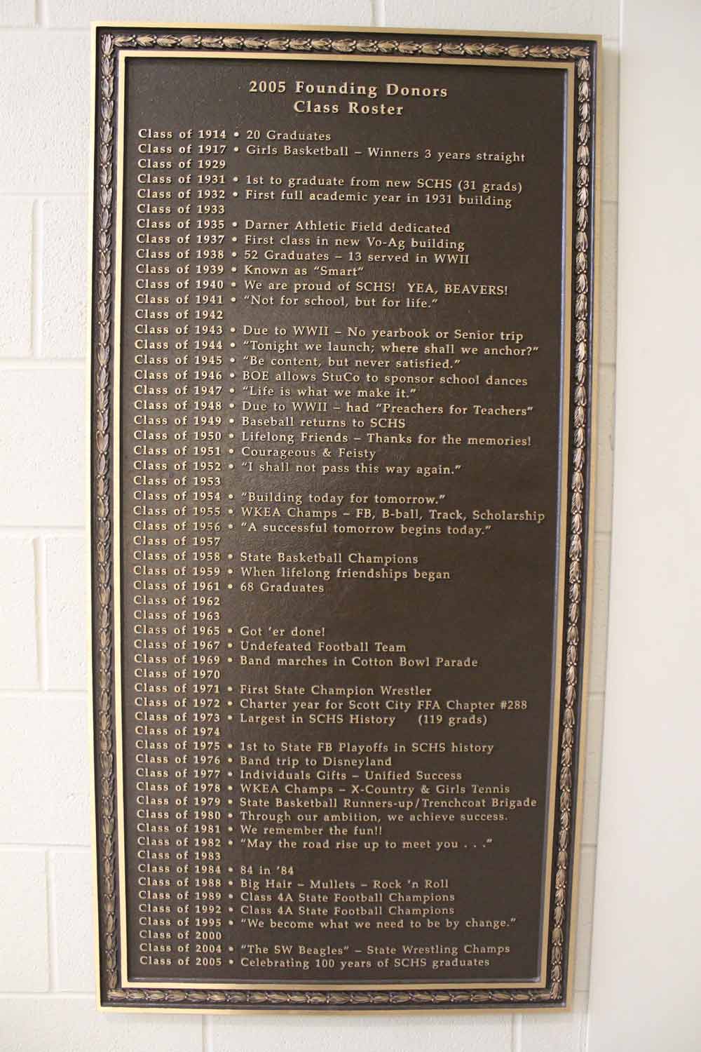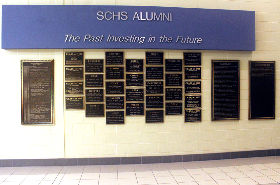 Listings or plaques can commemorate your graduating class, coaches, teams and teammates, individual families, alumni, teachers or events in school history. You may donate as a class, group, team, individual or family! What a great way to preserve your heritage as SCHS Alumni or Friends, with a permanent and visible exhibition for future generations to view and honor. Thank you to the SCHS Yearbook class for the photos above detailing the various Alumni Wall-funded projects.